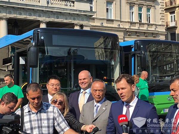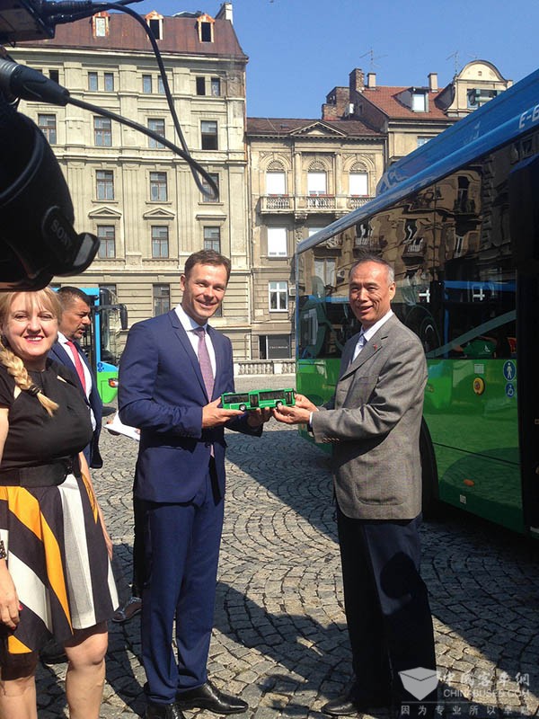 上午9時(shí)整,貝爾格萊德市政廳外,市長(zhǎng)辛尼薩、中國(guó)駐塞爾維亞大使李滿長(zhǎng)以及當(dāng)?shù)剡\(yùn)營(yíng)商和相關(guān)部門100余人參加新車上線首發(fā)儀式。儀式現(xiàn)場(chǎng),李滿長(zhǎng)向辛尼薩贈(zèng)送了蘇州金龍車模。