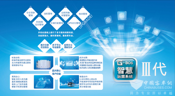 2010年,蘇州金龍推出歷時(shí)三年研發(fā)的G-BOS智慧運(yùn)營(yíng)系統(tǒng),該系統(tǒng)利用科技手段助力車(chē)輛的節(jié)能減排和安全管理,客戶(hù)實(shí)際使用后,車(chē)輛普遍達(dá)到3%-10%左右的節(jié)油率。G-BOS的誕生,標(biāo)志著蘇州金龍從客車(chē)產(chǎn)品制造商向客車(chē)運(yùn)營(yíng)管理解決方案提供商的戰(zhàn)略轉(zhuǎn)變。目前,應(yīng)用G-BOS的客車(chē)運(yùn)營(yíng)企業(yè)達(dá)2000多家,裝車(chē)數(shù)量超140000輛。
