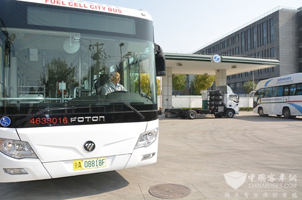 駛?cè)胗镭S加氫站的福田歐輝12米氫燃料電池客車