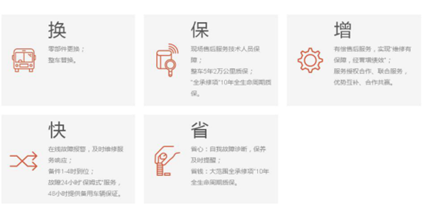 第二,提供"電池、電機(jī)和電控三大系統(tǒng)"的十年質(zhì)保,并提供24小時(shí)全天保姆式服務(wù);
