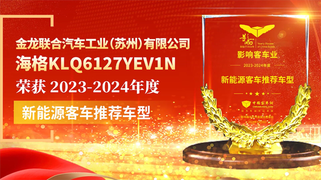 海格KLQ6127YEV1N榮獲2023-2024年度“新能源客車推薦車型”